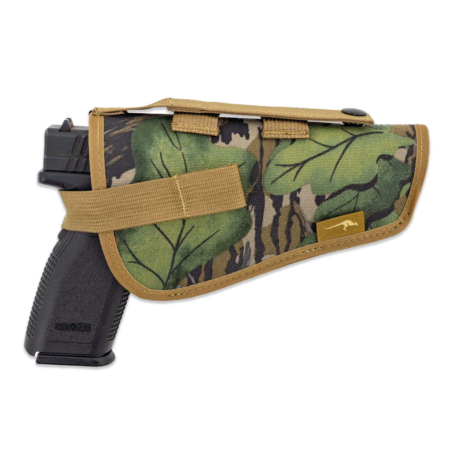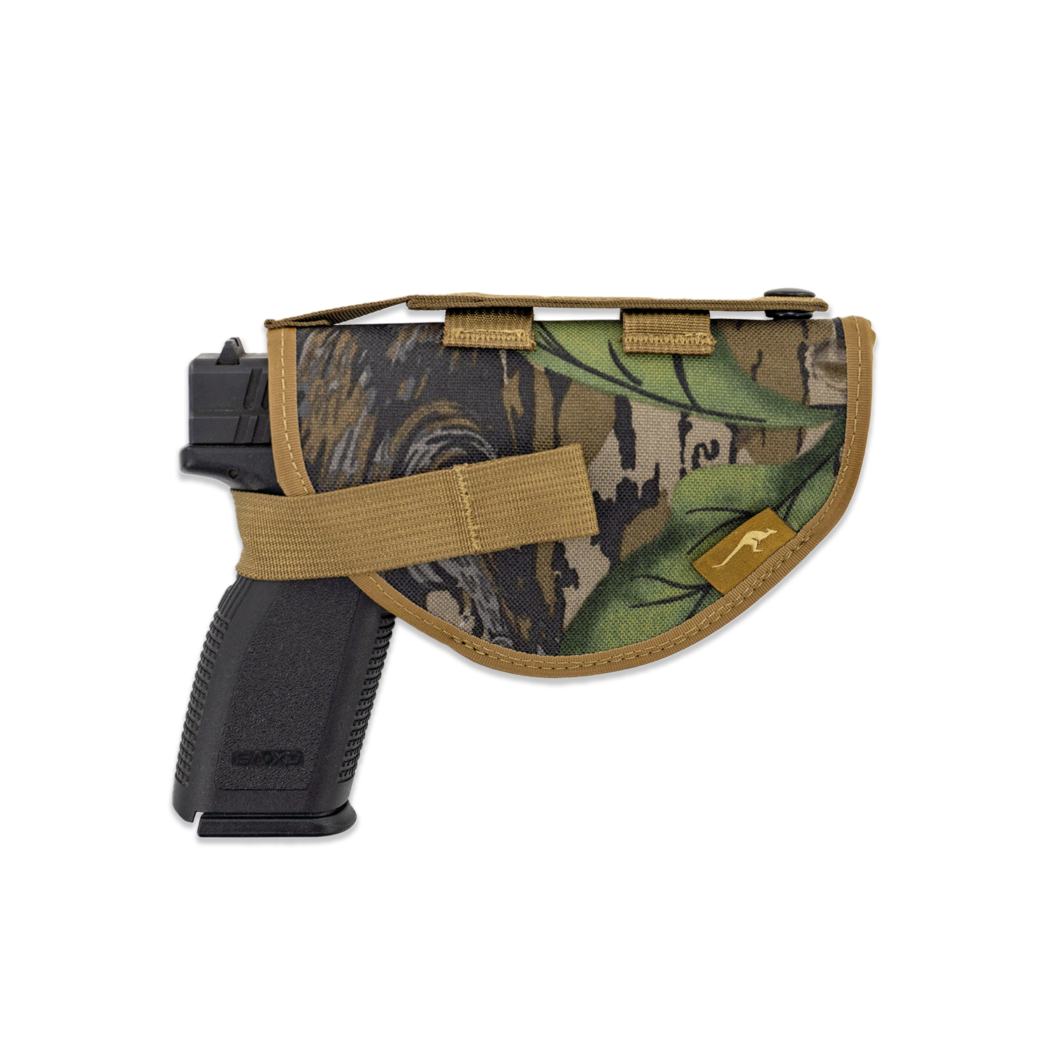 Your firearm stays readily available and secure in a structured/padded holster. Adjustable in size, the holster fits a wide variety of handguns and revolvers. Soft loop velcro material lines the holster's inside, allowing the retention strap to be adjusted for tightness. A ring snap secures the strap and can be released with a quick pull on the release loop. Attaches to the bottom Molle Webbing on Marsupial Gear Chest Packs. Does not interfere with side pouch attachments.