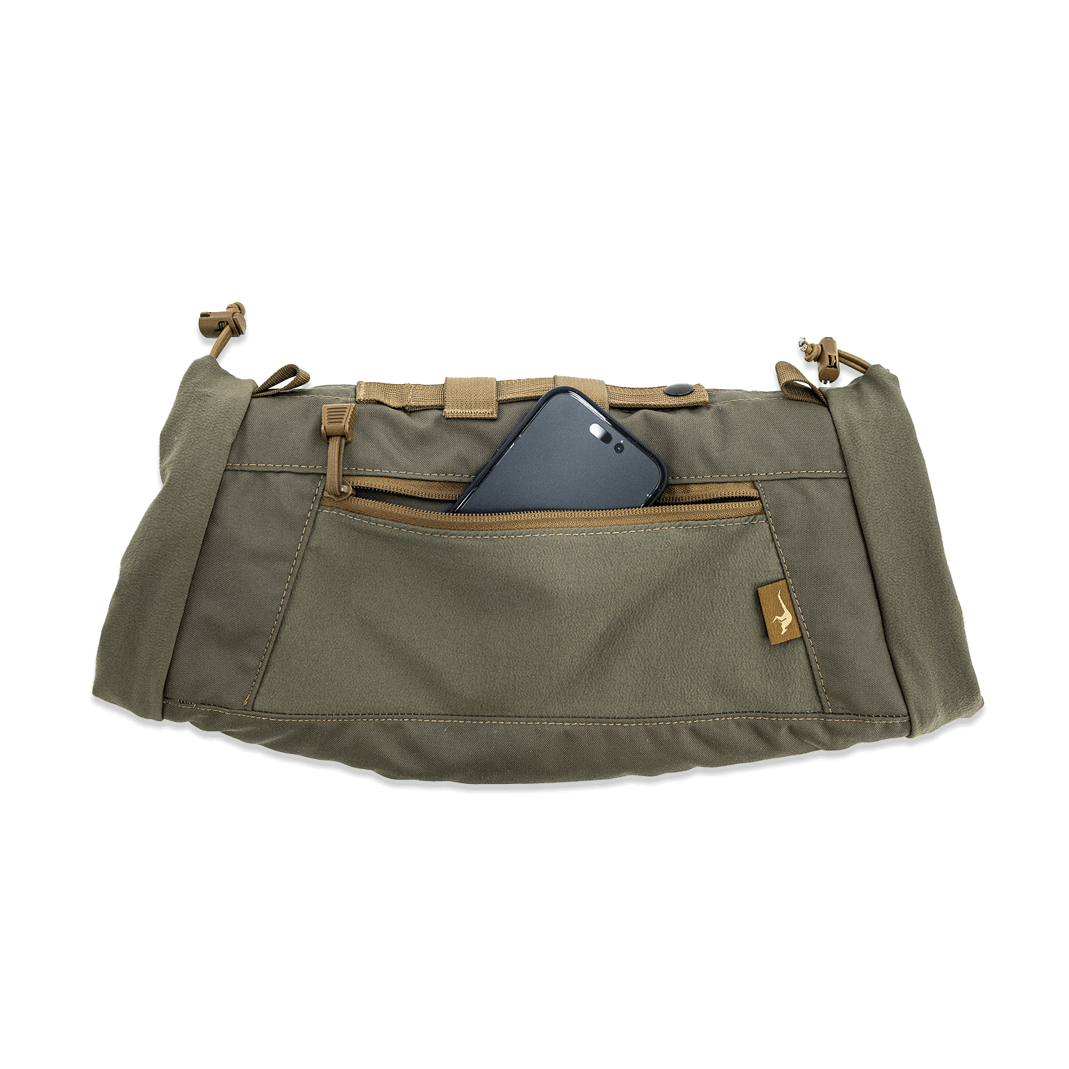 We added a stretch pocket on the front of the Muff that's big enough to fit the biggest smartphone and is a perfect place to store chemical hand warmer packets. The Muff attaches to the bottom of our chest packs via the MOLLE webbing or around your waist using the included waist strap.