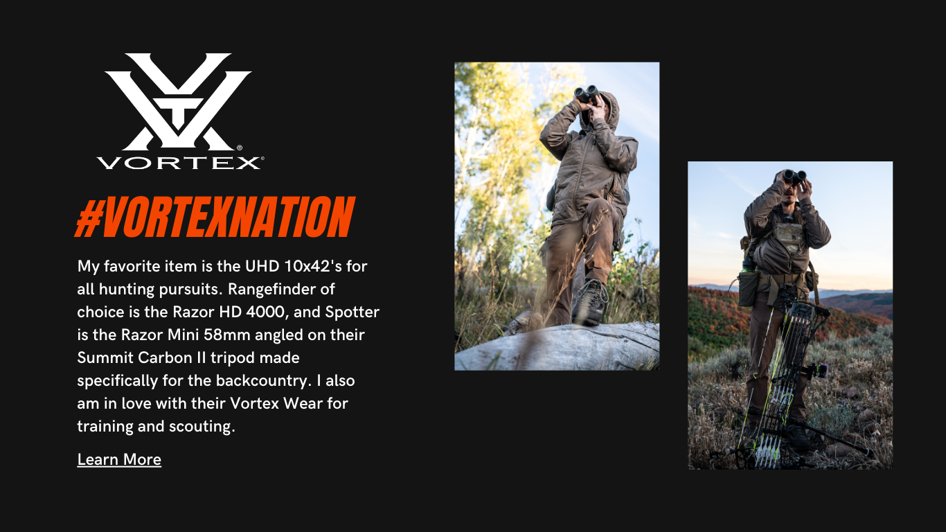 Vortex scopes, spotters, rangefinders and binoculars help me find more game. Not only affordable, but high quality that produces results.