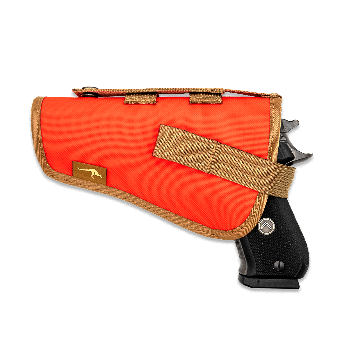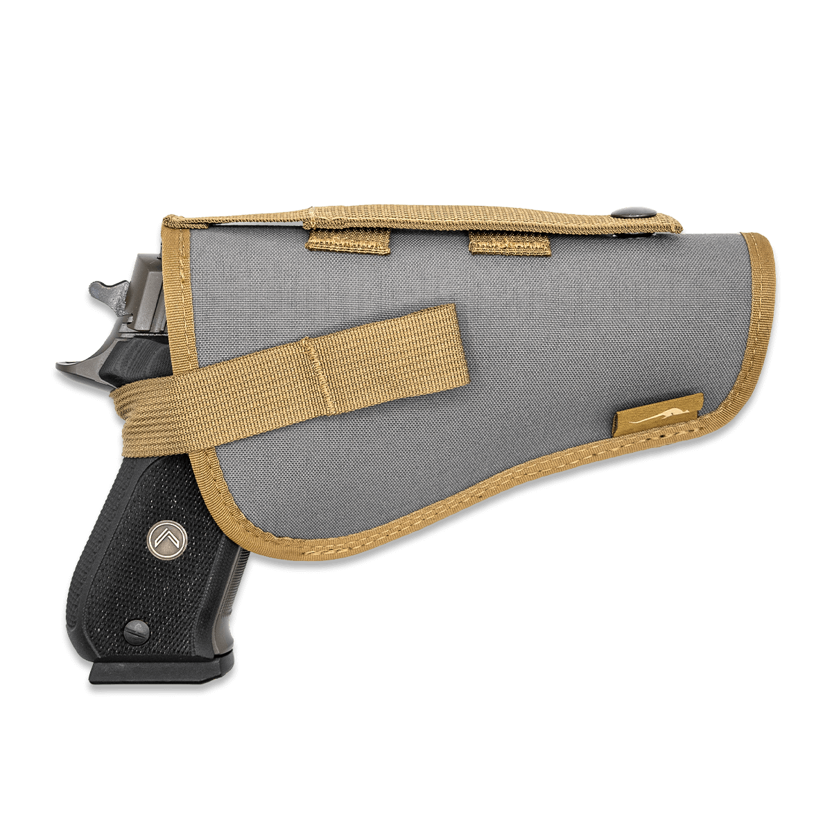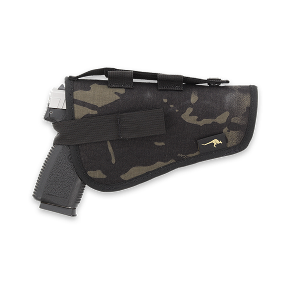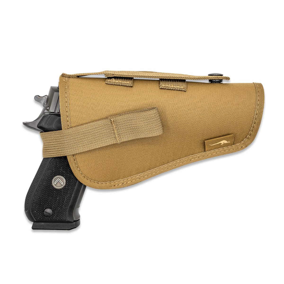 Your firearm stays readily available and secure in a structured/padded holster. Adjustable in size, the holster fits a wide variety of handguns and revolvers. Soft loop velcro material lines the holster's inside, allowing the retention strap to be adjusted for tightness. A ring snap secures the strap and can be released with a quick pull on the release loop. Attaches to the bottom Molle Webbing on Marsupial Gear Chest Packs. Does not interfere with side pouch attachments.